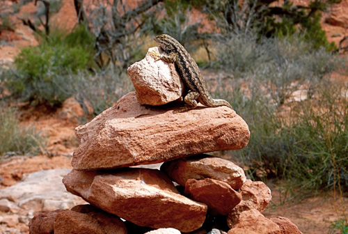 Todd Levin (1:43 p.m. in Utah): We’ve seen many tiny lizards skittering across the rocks, too fast to photograph, but just a minute ago I spotted a good, fat one sunning himself atop one of the cairns used to mark trails. He can’t be bothered to flee, even as we get in close with telescoping camera lenses. Yesterday, I saw a family of bighorn sheep grazing just inches from the shoulder-less highway in Colorado. In this marriage I am the best at spotting animals. Lisa is the best at most everything else.