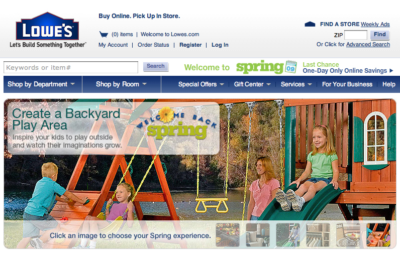 Rosecrans Baldwin (Chapel Hill, N.C): The right side of the Times’s homepage is taken up with an ad from Lowe’s for the first day of spring. I knew spring began today, but I guess that I didn’t know where. I click on the ad. Seems that spring begins in a suburban lake land where redheads breed, where the foliage is always fall colors, and the children like their slides so much, they die smiling at the top.