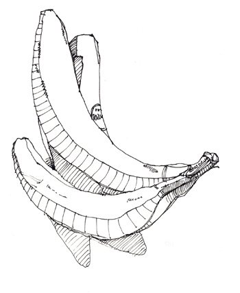 Our chart claims that this week the Peanut is the size of a large banana; I pick one out of the fruit bowl and we dress it in one of the new outfits. He already looks like me, though yellower.