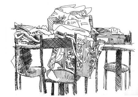 Every time I see Patti, she is still pregnant. I think about the baby quite often, not constantly, but she is always pregnant. It’s more and more obvious too, a hard little droop. When she leans back it just looks like an ex-jock’s tough solar plexus gone to pot. She says that she can’t really suck it in and that seems scary to me, this alien thing inside her, dictating what she can and can’t do with her own body. The fact that he moves around and she can feel it spooks me, too. He has a will of his own, quite separate from his mom’s (God, that’s weird to even type out… “his mom”), a separate person inside of her. When we haven’t gotten around to eating dinner until late, he starts to move about, protesting, a mini subcutaneous tantrum, telling us to eat, both of us.