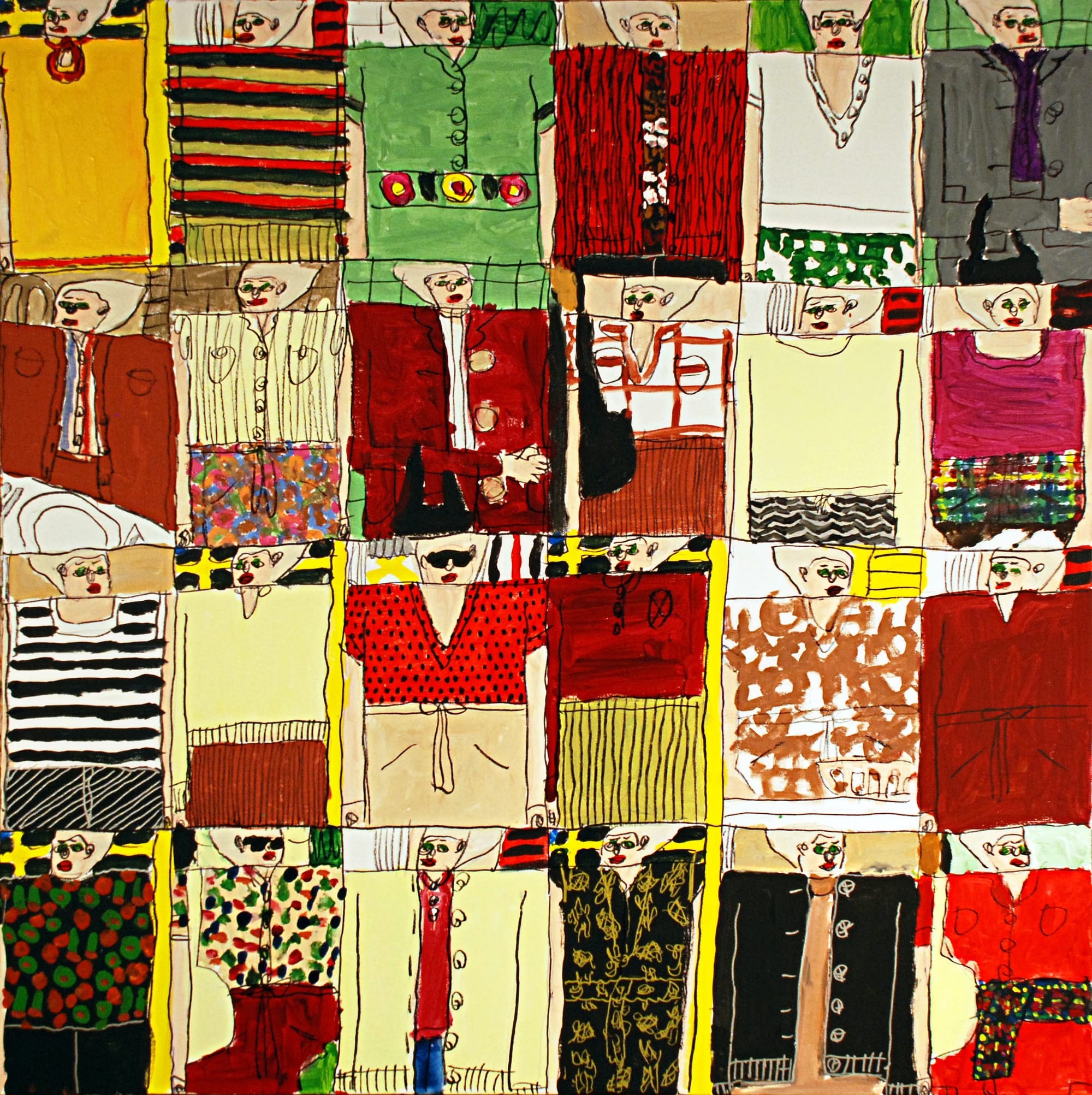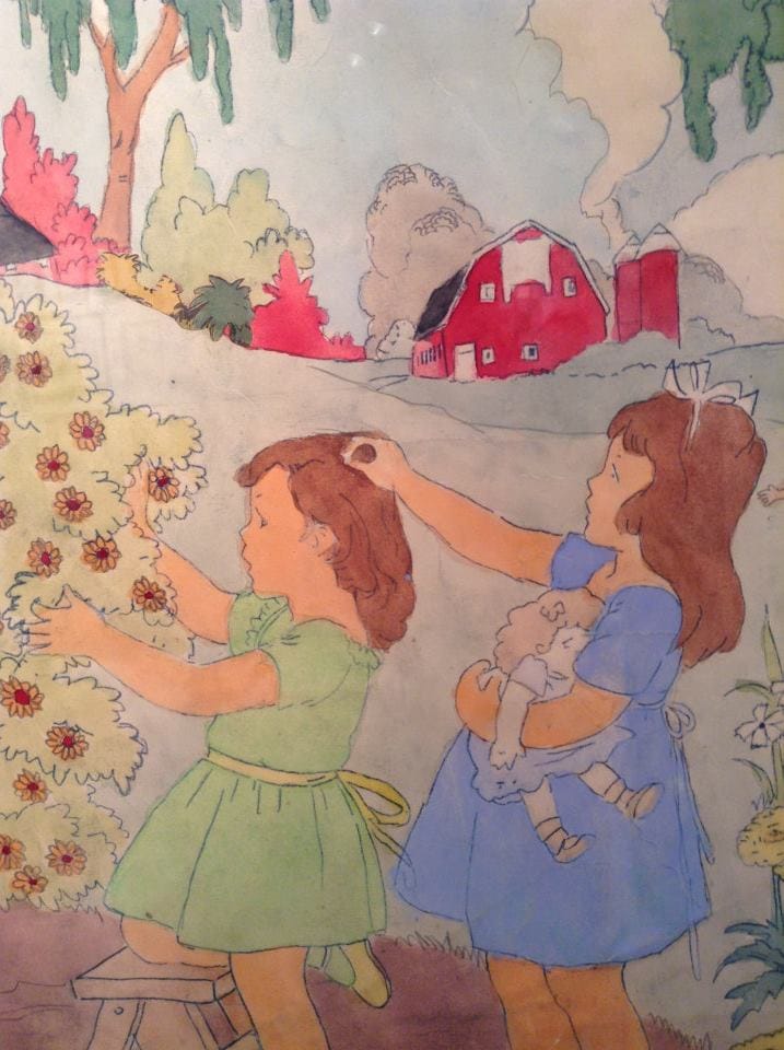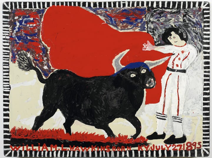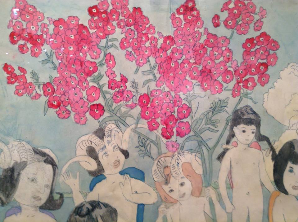 I know I smell like horses. I’ve come straight to the Outsider Art Fair in Chelsea from teaching riding, and I’m still wearing tall boots, jeans, and a T-shirt. I’m alone and looking at art. I take photos of the ones I like the most: William L. Hawkins, Susan Brown, Henry Finster, and a beautiful sixty-something woman with pink hair and colorful clothes who is her own work of art. And, of course, the Henry Darger scrolls. I get up close to them to photograph the details: a strange creature that could be a cat, the bright pink of a magnolia tree, a little girl sobbing.