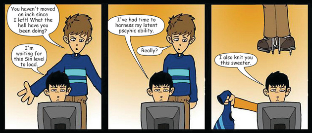The circuitous route by which I wind up in a conference room on a Friday morning watching strangers play video games begins with a 1998 comic strip.