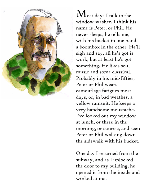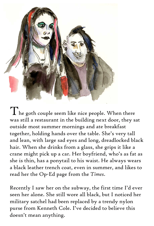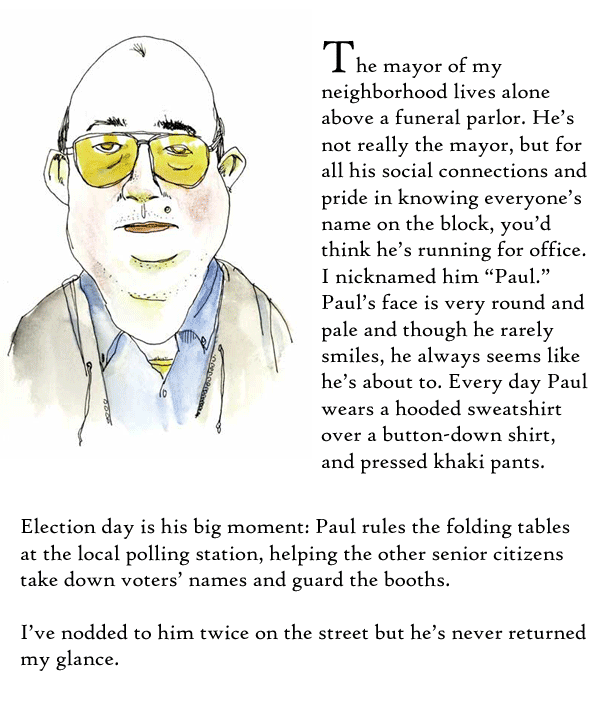 Live in a neighborhood long enough, you get to know everyone by face, if not by name. But who are these people, really, and what do they do? Rosecrans Baldwin describes a few local characters from Brooklyn, and Danny Gregory draws blind.