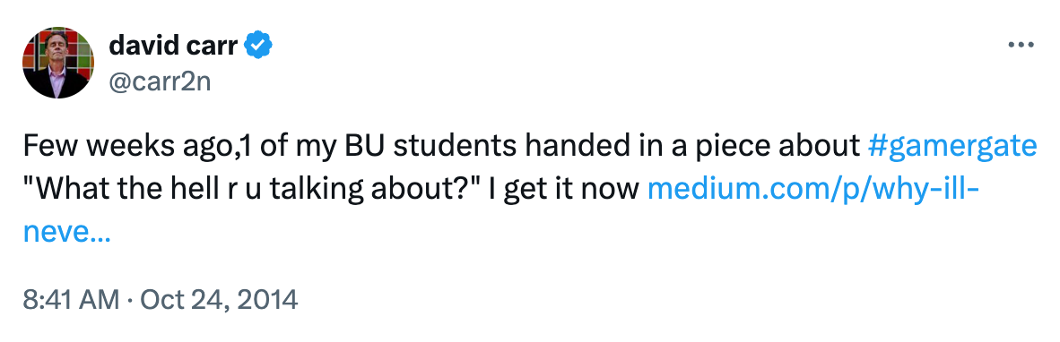 Anyhow. Carr had cut a piece by a white male writer with more name recognition than most of the journalists he’d included on his reading list. And the pieces he kept were fine. They were good, even.