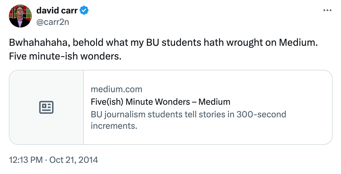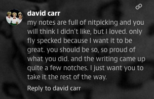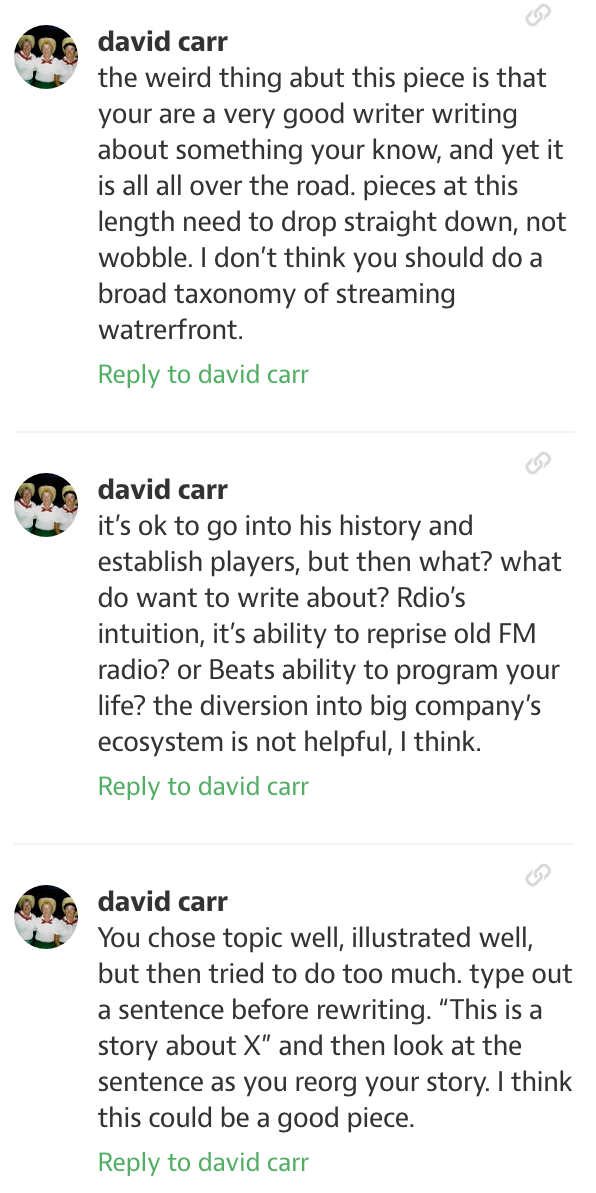 I went a bit overboard with the “voice lessons,” so I’m going to keep this short. Millions of people read Carr’s columns, and nearly half a million followed him on Twitter. He used his platform to promote work by his students—which is precisely the sort of generosity that made me (and everyone else) tweet at him and email him so he might promote my work. David Carr became a distribution model, and he did it by being a model distributor.