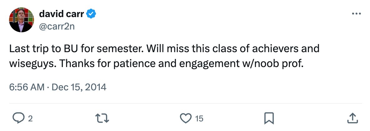 Tony Haile was right when he called time a “rare scarce resource.” There could never be enough time for Carr to tell us everything he wanted to. What we’re left with—and let’s strike that existential chord now—are the stories Carr shared with his students.
