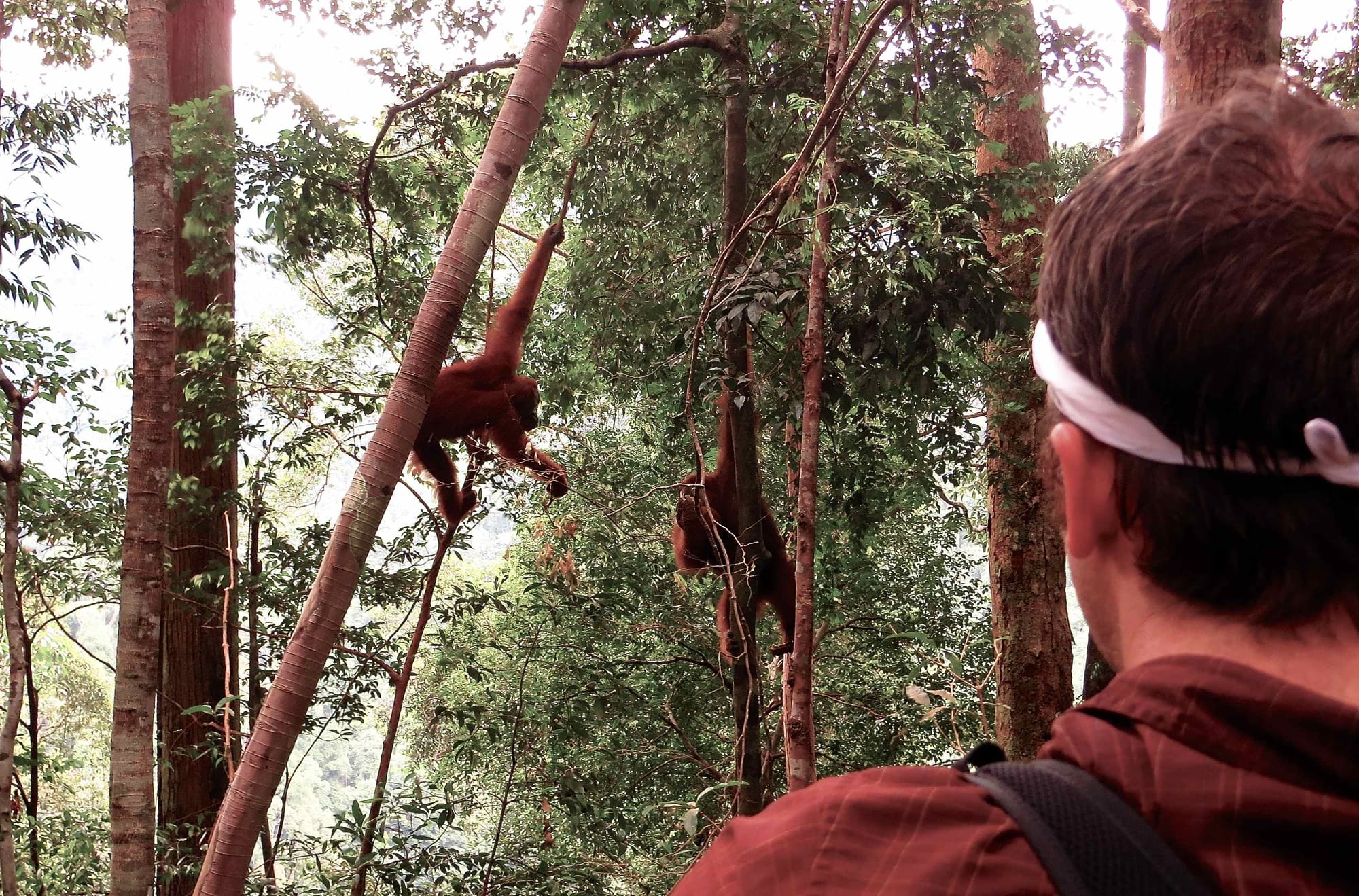 In the trees down the hillside before me, the leaves began to shake. A burnt sienna mass appeared between the green splotches. “Here,” I said. “Orangutan.”