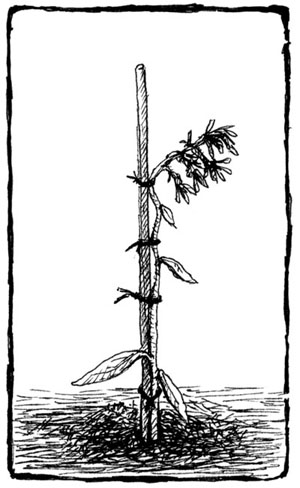 After a day or two I went out and staked the plants, but apparently this wasn’t soon enough for them. The flower stalks had already reoriented themselves toward the sun, so when I staked them they looked like this: