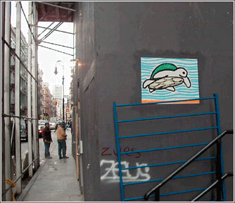 By night and by day, invisible hands are laying claim to the walls of New York City. They work quickly and are gone before anyone notices. What they leave behind is art, if not, a message. The prints, stencils, stickers, and other objects await discovery by a passing pedestrian—perhaps a woman walking a dog, perhaps a sales clerk on his way to night school—but unlike nearly everything else that decorates our public space, these communications are not hawking the latest shoes or the newest low-carb beer. Street art is many things. It is a resistance against the notion that only paid-for corporate advertising can take hold in our visual commons; the monopoly is to be broken. Street art appears underneath and along side of sanctioned billboards, sometimes replacing them. Other times, it appears on bare walls far from most people’s gaze. It is public playfulness. It is a gift, a knowing nod, to those who notice.