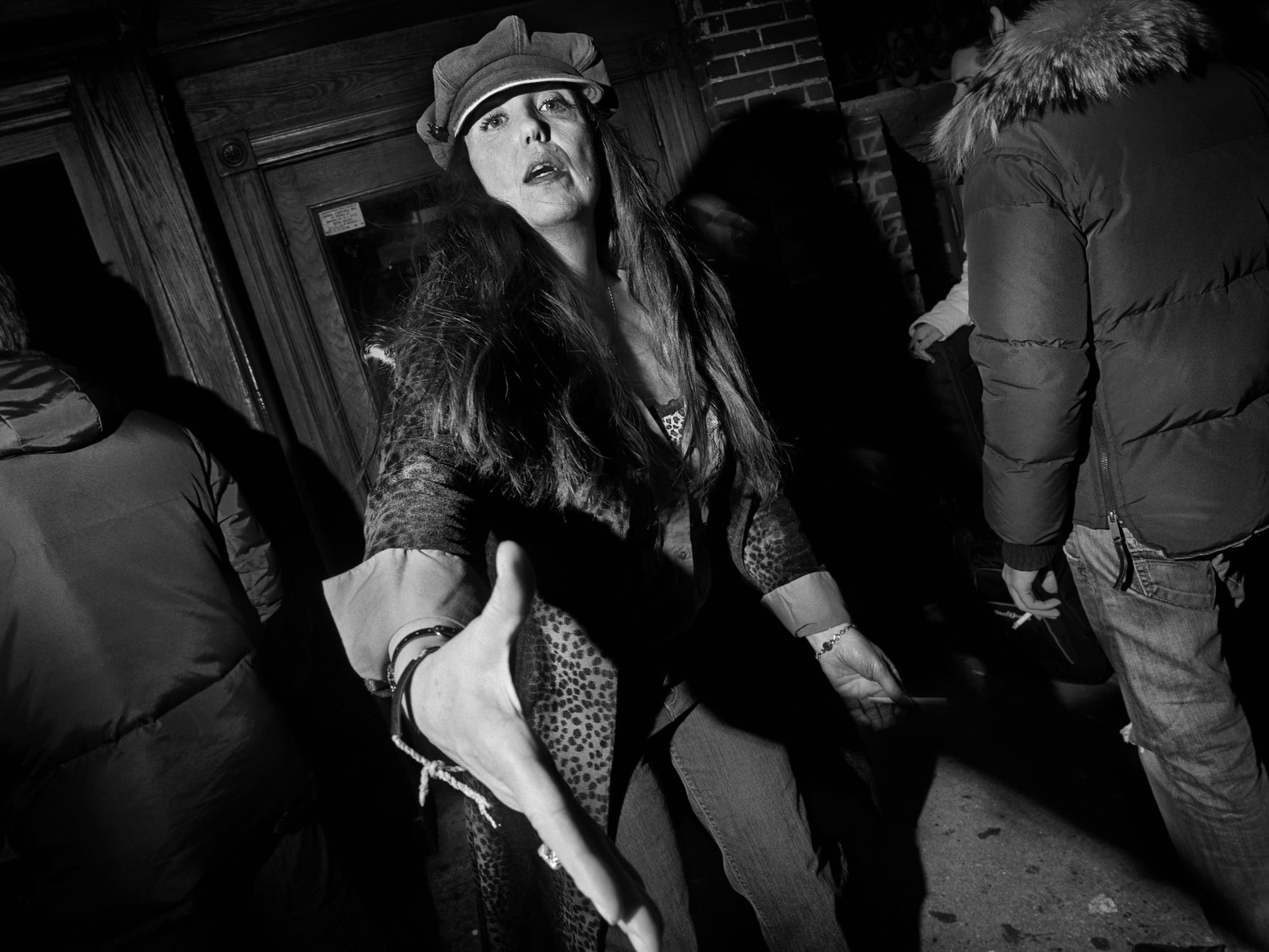 At the time, I lived on Thompson Street between Bleecker and Houston, five flights up to a 56-square-foot bedroom. I felt caged-in. I was so worried and anxious about everything that I was turning into an insomniac. I just couldn’t sleep. So I began to take late-night walks as a sort of therapy, and I always carried my camera. I’d leave my apartment at 11 p.m. or midnight and walk around my neighborhood, or sometimes down to the financial district, until 2, 3 or 4 a.m. I was in a pretty dark mood, but my neighborhood was something to see, especially at night. Bars and clubs and late-night restaurants line those blocks, and there was always a party, both inside and out. I started making pictures of the people and situations I saw. Pretty soon, it was clear that there was something to the pictures. I dropped three classes and did an independent study with my photography adviser, Editha Messina, and a history of photography course with Shelley Rice. Every week, I would bring enlarged contact sheets and prints of the photos I made the previous week or even previous night. I was using film, but I would either process the film in my apartment or on my lunch break, after loading film into canisters with a dark bag, while in Shelley’s class. I worked on this project from October to December out of necessity, not because I was trying to do street photography or anything else—it was a way for me to figure things out. Thankfully, it was also productive.
