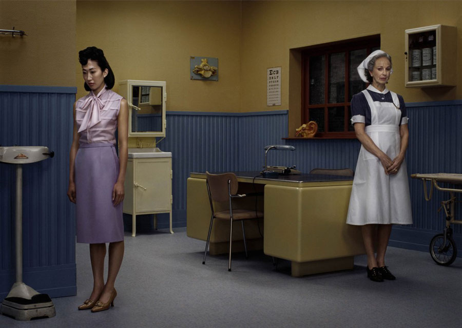 All sets are built in my studio. I work with a group of people, a set designer, costume designers, styling, makeup, and hair. What I always liked about the movie industry, and especially the movie industry in the ’50s and ’60s, is that many of them were set-built, and shot on that location. So you can idealize your world and really make your dreams come true for one second in photography. When I have my basic idea, I go to my set designer and we have meetings for set design, costume, and makeup. Then I make my choices, they design the set and costumes, and we build it. Then I can set the details that I want—it’s a very precise procedure to create this dream world, or nightmare.