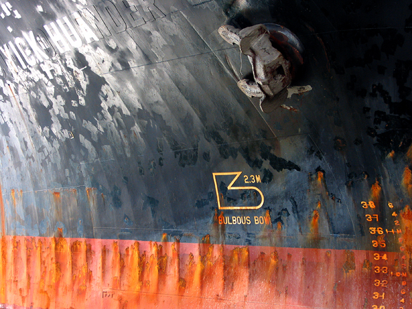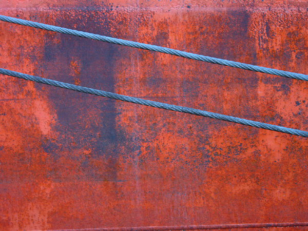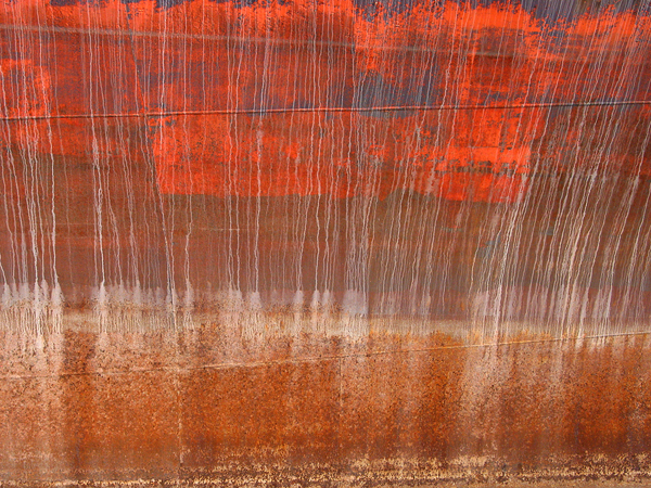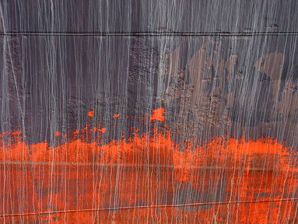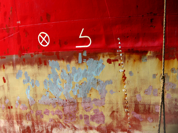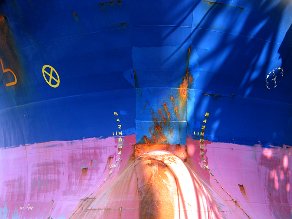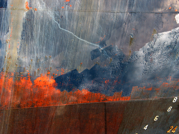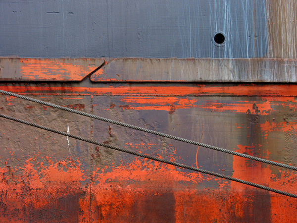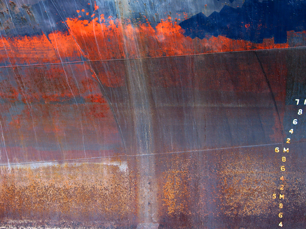 Marshall Sokoloff has captured a series of beautiful geometric photographs full of these colors and the rusty textures created by the sea bashing into steel. Interrupted by numerals indicating how high or low the ships ride in the water, or by fraying ropes, the shapes of the gently curving hulls extend beyond the rectangle of the frame on all four sides, compacting their three-dimensionality into powerfully concentrated two-dimensional compositions.