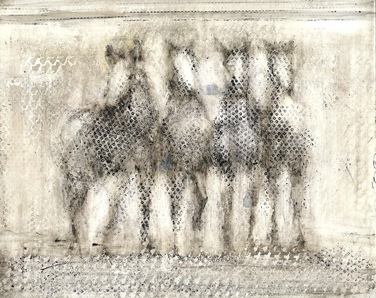 For a few months a few years ago the wallpaper on my computer desktop was a photograph of a band of wild horses galloping over a flat, marshy landscape of water and earth tones. It is an aerial shot taken from some distance. There are 16 horses in the frame and they span, generally speaking, the middle third of the image. If a compass and the photograph were synched, the horses would be running east, and since this is a photograph of a band of wild horses in south central Florida, that would mean toward the Atlantic. Even though the herd does not register as much more than specks in the scene, these specks still communicate speed and animal physicality. I was living in New York City at that time and the image struck some chord inside me about the world beyond the Bronx. Plus, I’d always loved horses, even though it had been years since I’d spent any real time with them. It was a sentimental nod to the schoolgirl I used to be.