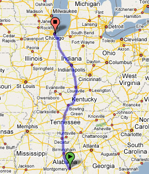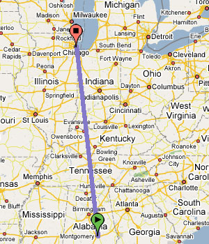 Answer: First, consult Google Maps or a similar search engine. You will see that Montgomery, Ala. to Chicago, Ill. is a fairly straight shot: