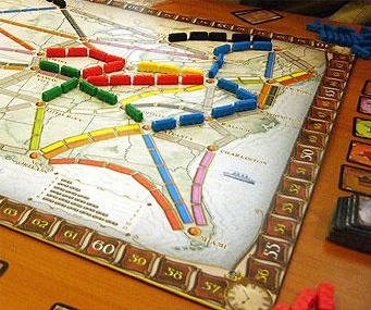 Ticket to Ride has been racking up kudos ever since its release, even garnering the prestigious “German Game of the Year” award. So what do you care what a bunch of Germans think about board games? Well, Germany is the center of the board-game universe for sociological reasons I don’t even pretend to grok, so being named “German Game of the Year” is like being named “Japanese Inscrutable Hyperkinetic Animated Movie of the Year” or “Canadian… uhhm… Maple Syrup of the Year” or whatever. Anyway. The game board shows a map of the U.S. with cities connected by a web of train routes. Players claim routes by collecting and playing sets of train cards. But a route claimed by one player is unavailable for use by the others, forcing opponents to seek out detours. Ticket to Ride is tense and exciting, but the indirect nature of the competition is perfect for families and friends.