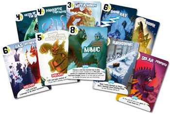 The “Yahtzee mechanism”—throw some dice and reroll twice—has been put to grand use recently. Roll Through the Ages, for example, lets players build a civilization from scratch in half an hour, while Elder Sign has them fending off Lovecraftian monsters. Now King of Tokyo combines the two by dropping monsters into the midst of civilization. Designed by Richard Garfield, the creator of Magic: The Gathering, King of Tokyo casts players as behemoths such as Gigazaur and Cyberbunny, wreaking havoc on the streets of Japan. All monsters begin equal, but collect mutations as the game goes on, everything from parasitic tentacles to the ability to breathe fire. The Yahtzee mechanism and the b-movie setting make this game feel familiar, but the variability in special cards and powers ensures every game is different. [More info]