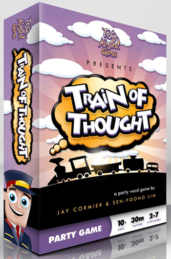 Charades, Taboo, Celebrities, Pictionary—there is no shortage of “get your partner to guess the word” games, both on the market and in the public domain. With more released every year, a game of this breed needs a novel twist on the formula to stand out from the crowd. Such a game is Train of Thought. And the constraint imposed on the clue-giver in ToT is a doozy. The active player is given a random word, and tries to get the rest of the group to guess it by giving them a three-word phrase; the first word of clue phrase, though, must be a second random word, completely unrelated to the first. Thus, you may find yourself trying to get the group to shout “cinema” with a three-word phrase that begins with “celery.” The clue giver can incorporate incorrect (but close) guesses into future clues for the same word, which allows the group to lurchingly hone in on the correct answer. There’s a great sense of satisfaction when you can smoothly guide a round of Train of Thought into the depot, but, as is usual with these types of party games, it’s often more fun to watch a round go completely off the rails. [More info]