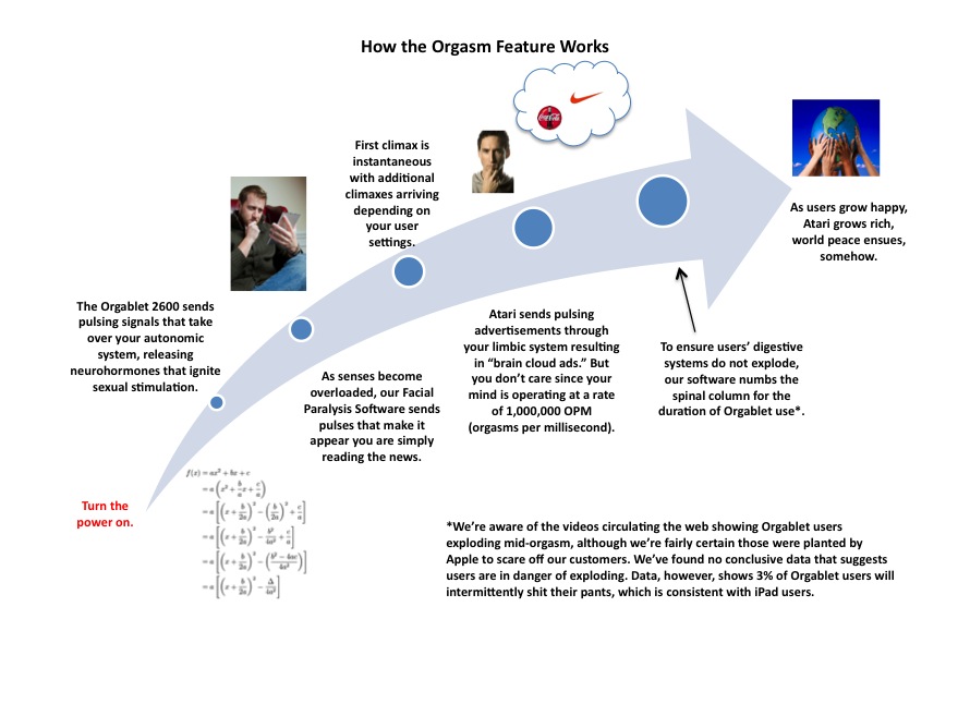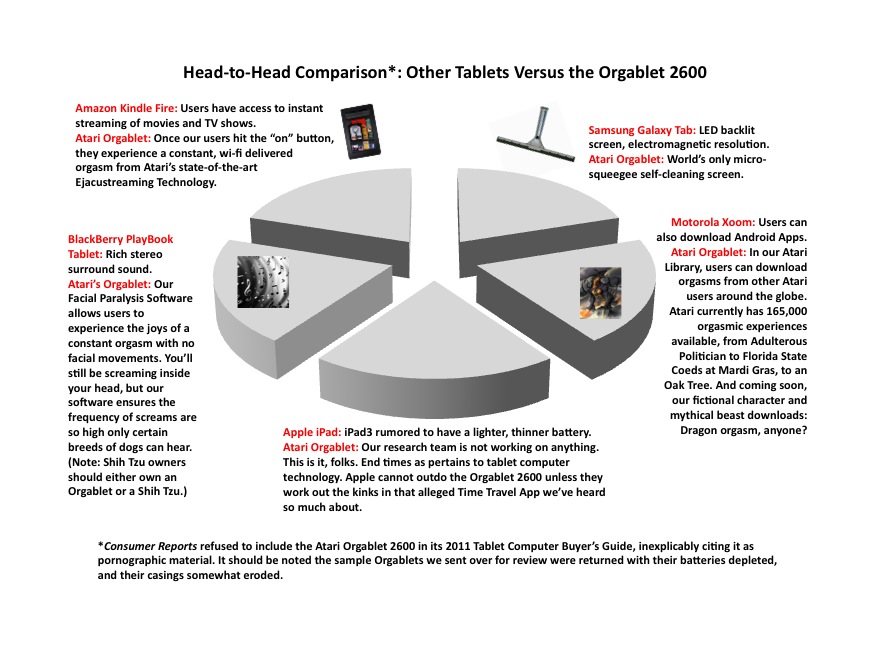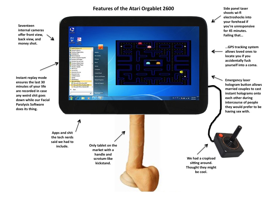 The Atari Orgablet 2600 By Jon Methven in Spoofs & Satire — 07 Nov 2011 From the Kindle Fire to the iPad 2, the market is flooded with tablets. But only one can deliver a constant orgasm directly to its user.