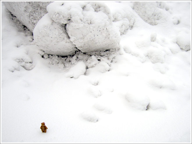 In some of the pictures previously published at The Morning News the bear stands in a landscape that humans have just barely begun to enter. Later, when we traveled to Paris (and Washington, D.C. and other places closer to New York) the environments the bear encountered were almost completely manmade. They felt very fascinating and intriguing, but they were very obviously the products of human imagination and maybe, thus, they were easier for the viewer (and the bear) to grasp?