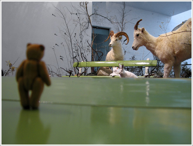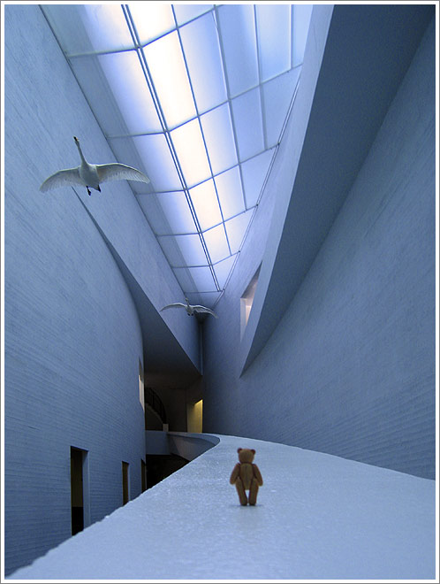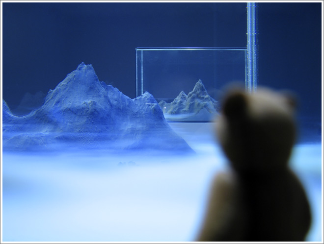 The bear and I were in town to visit Kiasma, the amazing contemporary art museum designed by the American architect Steven Holl. The space is incredibly interesting by itself (there is a picture of the bear in the main entrance hall scaling what appears a gigantic snow ramp), but now this exhibition environment is populated by hand-picked pieces from an international group of artists as part of Ars 06, an important contemporary art show which takes place in Helsinki every five years. The range of work reached from the timeless gouache paintings by Amy Cutler to the snow globes by Walter Martin and Paloma Muñoz, and reached all the way to video installations like one by Mai Yamashita & Naoto Kobayashi.