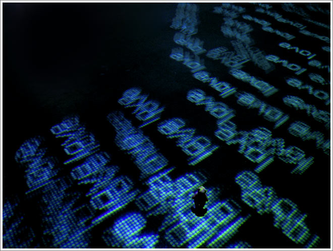 It was fascinating to look at the work of Ars 06 with the bear as a mediator of sorts. The environments encountered were created by human artists, but the ideas, and often their execution, felt to be toying with scale as well. In the same photograph in which the bear appears to be climbing the seemingly snowy ramp towards Kiasma’s galleries there are two swans flying overhead. The birds, as well as the animals gathered in the next photograph, were part of an installation by the Swiss artists Gerda Steiner and Jörg Lenzlinger. In the next photograph, the bear feels tiny in the stream of projections of love in a large piece by Charles Sandison.