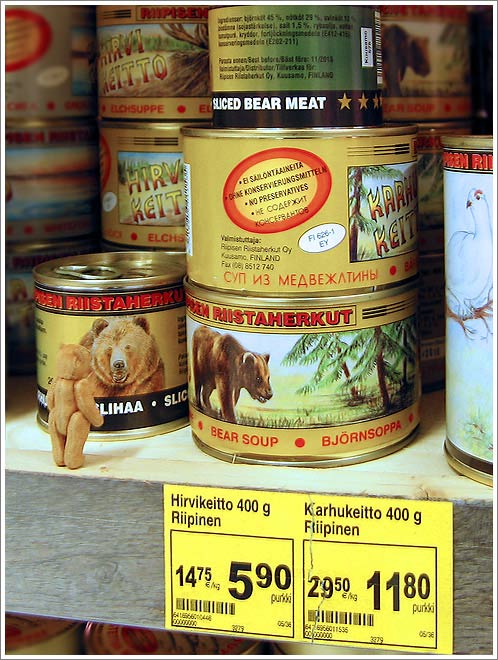 The bear heads abroad again, this time to Finland, where even a groundbreaking art exhibit can't distract him from the cans of bear meat on grocery store shelves. A gallery of photographs from our smallest correspondent.