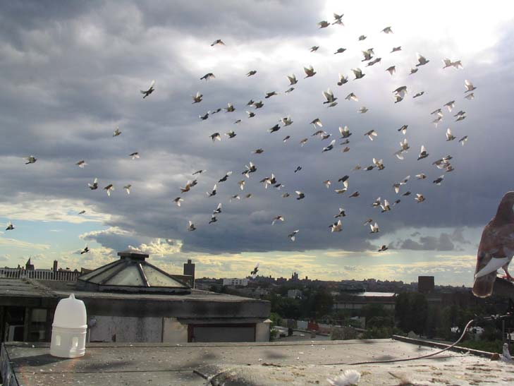 The pigeon wars are raging high in the sky over Brooklyn. It’s the end of summer, and the weather’s just right. That’s the word at Broadway Pigeon. Rick lost quite a few birds last night but gained some back. Mikey came out with 12 over. Everybody’s counting. The bands on the pigeons’ legs make it clear where they came from. A gold band might announce that a bird belonged to Dream Team II: the Bushwick Hellhole. Another might have come from Big Bob, Broadway & E. Flushing. Chico from Halsey. Pepi & Son’s, Bronx, N.Y.