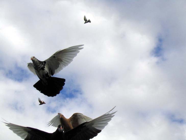 At first, the flocks aren’t easy to spot, but then the black dots whirling in the low sky become visible. The black dots turn in unison, left and right, as if they are all tied to the same string. Many coops have rolled out their birds this afternoon. There must be half a dozen flocks out there. The flocks become more visible against a white cloud, but when the sun shines a certain way, the light catches on the wings and the flocks shine white. They circle around a roof, but then slowly spiral out toward other places, depending on how the wind is blowing or whatever catches the instinctive fancy of like minds. They look like little tornadoes.