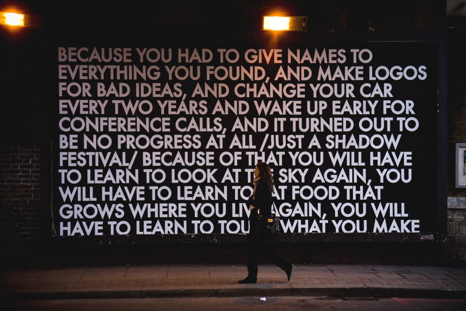 The poems on Old Street are set in capital white letters on a brushed black background, in a sort of mangled Futura; it’s a type treatment that should send his words running and screaming through the streets but somehow does not. Instead, the words lean calmly against the wall and arouse a kind of subtle and unnoticed reflection. People pass by on their way to or from here or there. They do double-takes and slow down. Intrigue wraps their faces. They stop, read, think, and eventually move on, carrying something with them that maybe wasn’t there before. Something that came free, silent and unexpected, set in capital white letters on a brushed black background.