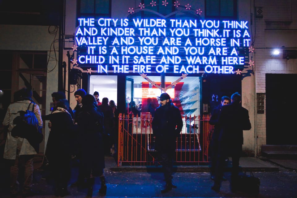 Tucked away in an otherwise dim pocket off London’s Old Street, a short poem hangs from a building’s facade and shines in the night sky. The poem is constructed of wood, solar panels and 12 volt LEDs. It radiates the light it has recycled from the sun. A small crowd stands beneath it, smoking cigarettes and talking in the cold February air. A larger one moves and shifts slowly behind them, in and out of the narrow room inside. People sip wine from glasses and drink beer from brown bottles with red and white labels. Music and poetry paint the walls.