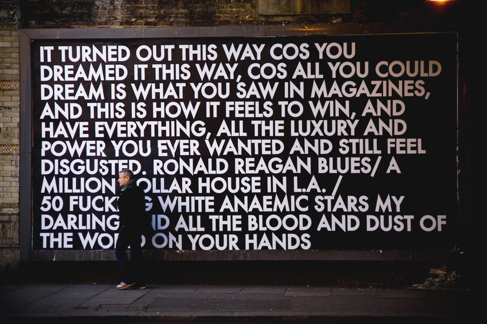 Situationist invades Hoxton... Street poems arouse Londoners... Public discourse colored by disfigured Futura... Robert Montgomery’s street poems have something to say to you.