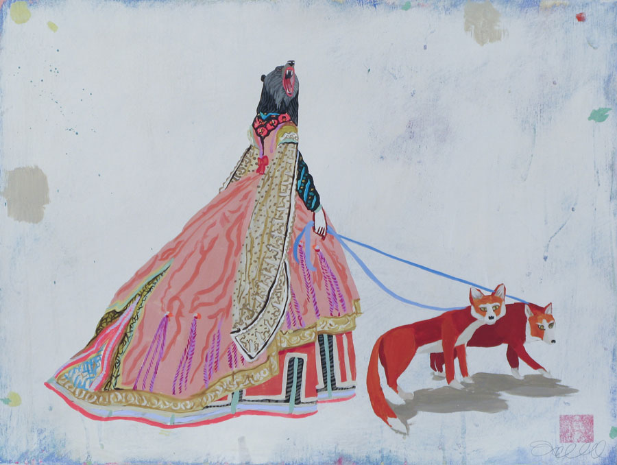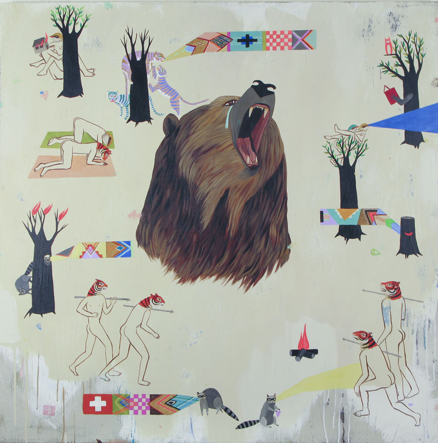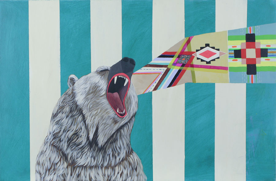 Most of my imagery comes from places I have lived, as well. I grew up in Oregon spending a lot of time camping in the summers, being out in the woods. I love animals. I love nature. I am also dramatically influenced by the time I spent in India visiting family—the extremely bright colors that are used in political propaganda, all of the animal imagery used in temple art.