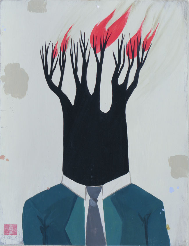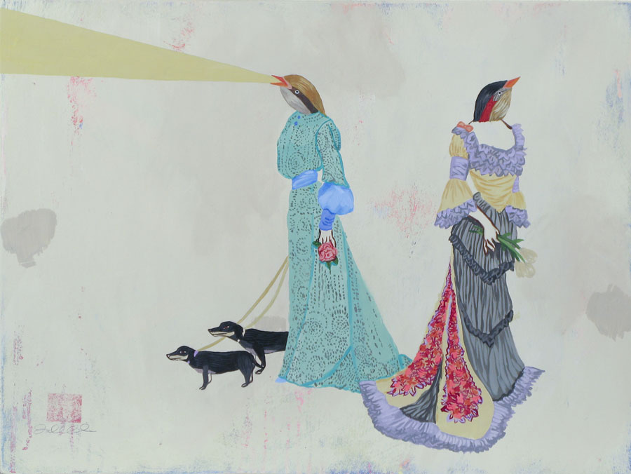 I traveled to Chile when I was 20. I was reading a bunch of Latin American writers at the time, so perhaps some of the magical realism in the literature affected my painting. The first girl with a bird head I painted was a cartoonish portrait of this girl in Santiago. I was living there, painting and playing in bands. My band mate lived on the twenty-first floor of this building with his girlfriend. We would sit around and drink wine and do lots of drugs, and his skinny, model girlfriend would wander around the apartment talking in a little high-pitched voice. She was like this little beautiful bird in a cage, living up above the dirty city. Continue reading ↓