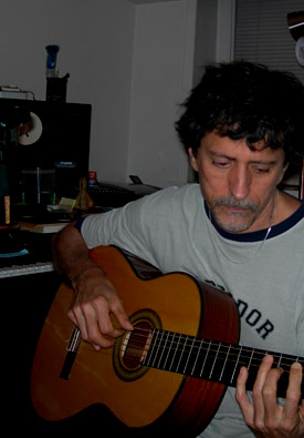 A short walk brings us to Cantuária’s studio in the heart of Park Slope. He saunters over to a spot in the corner, grabs an acoustic guitar and fills the room with an improvised mix of intricate folk and jazz picking. As his fingers move effortlessly across the fretboard, the instrument seems like an extension of his body, speaking in some complex melodic language.