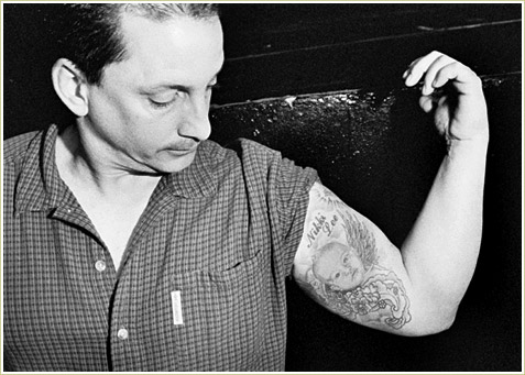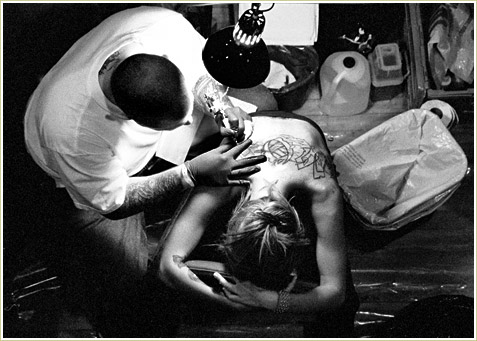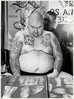 The Ballroom itself is a freaky concerto of the whine of tattoo needles, Bud Lite-induced moose calls, and the sound of chunky women complaining. This is the Sixth Annual New York Tattoo Convention, May, 2003. Carnival sideshow banners hang from the ceiling—‘Live Freaks!’ they promise. In exposed booths around the two-level ballroom, everyone in the tri-state area without a college degree is getting a tattoo.