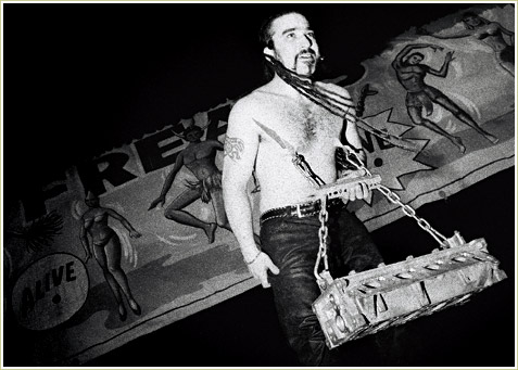 Amid the boring interesting madness, a performance begins on stage. The Great Nippulini has terrible long, braided hair, shaved on the sides. I’d like to shampoo him endlessly. A kid with a mohawk named Swivel helps the performer attach a bowling ball to clips that run through his nipples. By Swivel’s account, this bowling ball is ‘heavy as fuck.’ Knowing when to really work a theme, Nippulini removes the bowling ball and then attaches bowling pins to each nipple and swings them around like a cheap poledancer. ‘The new earrings that the chicks in the hood wear,’ he pronounces. A new volunteer helps Nippulini attach a 30 pound anvil to his nippleclamps. ‘I’ve never trusted a man with my nipples as much as I am right now,’ he camps meaninglessly. A girl in the audience shrieks. His nipples are horribly distended. For his final act, he tows four really skanky girls around the stage on a little cart, using only, of course, his awful awful nipples.