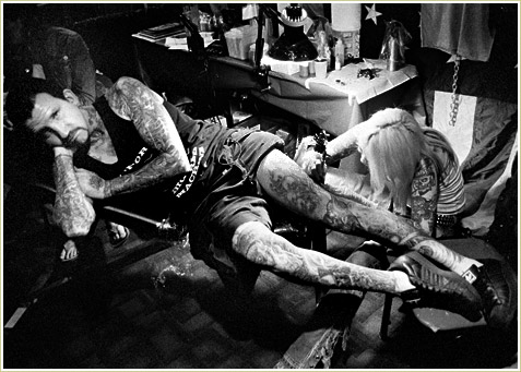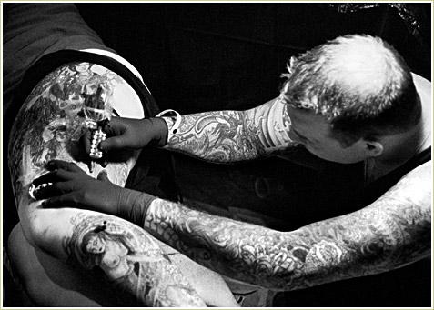 Back at the bar, everyone is drinking plastic-cupped cocktails of Ketel One and Red Bull. I look around. This doesn’t feel subversive at all. It’s not underground or freaktastic. It’s commercial. Where’s the anarchy? And, where’s the art? Leafing through dozens of tattoo books, the designs look stale. The popular big black tribal tattoo revolution is nearly twenty years old now. What’s the new hotness? Bugs, an artist from London, is doing a WPA/Cubist sort of tribal thing. It’s a little too unvivid for me but at least he has a house style. And really, this convention is an unspeakable parade of ass-crack. The sight is a weird melding of punk, heavy metal, and country, and it smells unmistakably of Bayshore and Bayonne. It is a trade show wrapped in a freak show. Under the bright white lights, all the tattooees look like corpses. It is not, however, a poser-heavy convention—you can’t fake a whole body covered in ink.