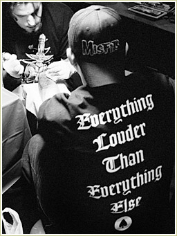 Products are hawked. Tattoo Goo, for the life of your tattoo! The ‘Nobody Knows I Worship Satan’ shirts seem to be a big seller. They are only worn by people who look most like chicken-head-biting Satanists. Brass knuckle belt buckles appear, an item which I challenge you to say ten times fast. The International Tattoo Directory is as big as the Mexico City phone book. And to actually get tattooed here you must first make an appointment and then enter the Sterilization Room. I have Silkwood fantasies of this room. Really they probably just throw some rubbing alcohol on you and make sure your eyes aren’t completely jaundiced. But, as if in a bad apocalyptic movie, The Sterilized wear blue wristbands which they may not remove.