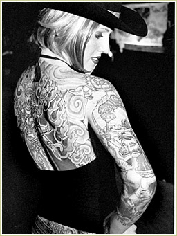 On our first of the three days of the convention, the crowd overwhelms us. Doughy men in kilts eye the nubile hootchie girls who school like exotic dangerous fish. Butch guys purse their lips against the pain; their soul patches quiver. A few bulldykes saunter through, spiders curling up their massive biceps. They give a nasty look to the dumb kid in the Deep Throat t-shirt. The globe-trotting bad boys of the tattoo world at Triple X are having a beer while they leisurely tattoo. A fresh-faced girl’s tank top doesn’t cover her titties; they are very pierced. At the Tattoomania booth, a woman complains: ‘I could never live in New York, but everyone in Hollywood is in a band or whatever. ‘Like, hey! Did you see me in that movie?’’ With my back turned to hide my laughter, I imagine her making the international sign for bulimia. At Super 88 Tattoo, the Massapequa home of traditional Japanese work, they use the Japanese version of Saran Wrap for tattoo aftercare. That’s cool. Badass Shanghai Kate from Buffalo is inking a girl in a ‘tits for tats’ t-shirt. That’s cool too. ‘Report all complaints to the Board of Health’ say the signs everywhere.