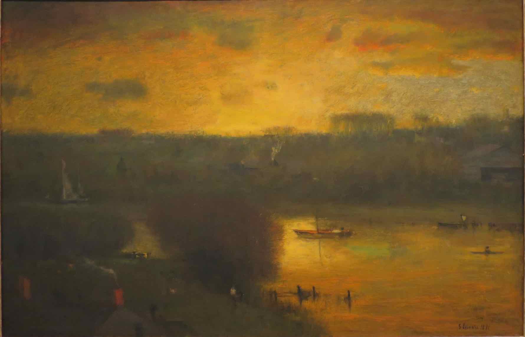 Inness has removed the brushwork in favor of recording the landscape as it was. Compare that to this one, a later work, “Sunset on the Passaic” (1891), smothered in burnt orange paint: