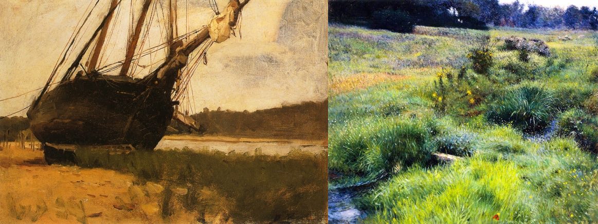 Some painters in the 19th century take the application of paint as the emotional core of their work so seriously that they switch styles entirely through the years. Look at these two Dennis Miller Bunker paintings: