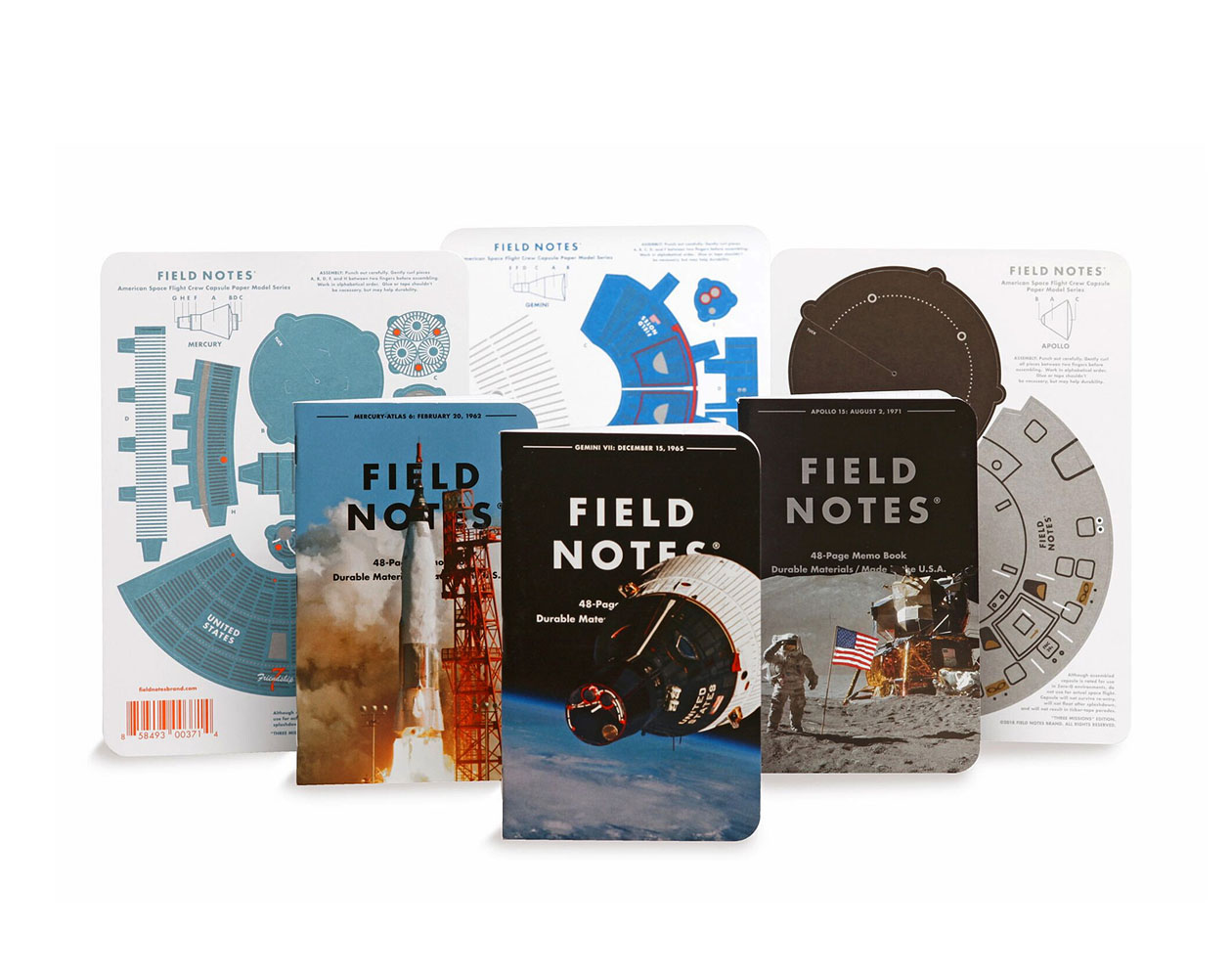 Field Notes “Three Missions” Edition celebrates American space flight and the Mercury, Gemini, and Apollo missions. Includes paper crew capsule models. It’s one small step for note books.