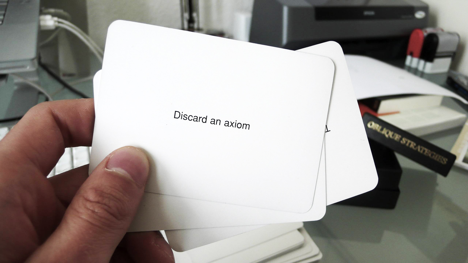 Created by Brian Eno and Peter Schmidt in 1975, Oblique Strategies are a deck of cards, each with a single, sometimes vague statement that, depending on how the individual interprets it, can spark a creative solution for navigating past a creative block. Shuffle the deck, draw a card, let it inspire your next move. Most famously, Eno used the cards with Bowie during the writing and recording of their Berlin collaborations (Low, “Heroes,” Lodger). Examples of Oblique Strategies include “Tidy up” (a favorite), “Do nothing for as long as possible” (I would but the clock’s running), and, especially relevant:
