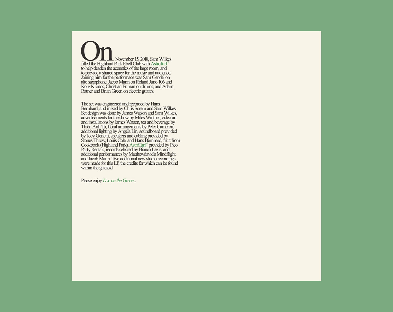 While it’s an admittedly unorthodox move to follow up your debut with a live album — particularly one that pulls half its tracklist from the debut — Live on the Green nevertheless feels like an artistic expansion for Wilkes. Despite the abundant good vibes, there’s an undercurrent of sadness that runs through these songs that was missing on WILKES. On that album, the gorgeous closer “Descending” felt like a mission statement whispered from one lover to another. On Live on the Green, where its two airy parts surround Alice Coltrane’s “Sivaya” and a new original called “Unsure,” “Descending” feels like a long exhale made bumpy by tears, the end of one thing finding strength in knowing that it’s the beginning of something else. (Aquarium Drunkard)