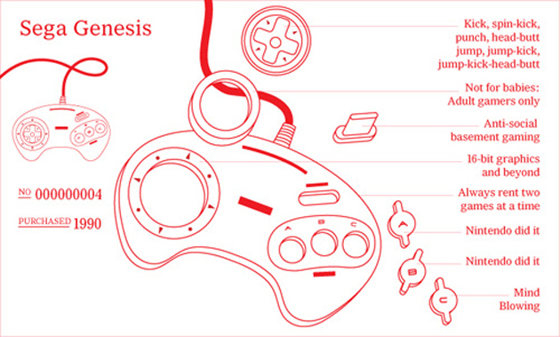 While the NES was approachably boxy, the Genesis was designed with a black semi-matte casing, contoured like a sports car. It confidently stated, “Hey, I’m not some kind of goddamned baby, you know.” The controller matched the NES’s “A” and “B” buttons, but added an additional mind-blowing “C” button.