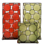 These groovy hurricane lamps are made of painted capiz shells, which give a soft glow when lit from behind. They’ll update any mantle. The larger holds a 10-inch pillar candle; the smaller holds a three-inch pillar.