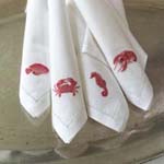 Crustacean napkins for the clambake hosts. They’re nice and big, 16 inches square, which offers plenty of protection from garlic-butter drips. The little critters on the corner are hand-embroidered and happy.