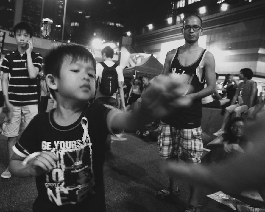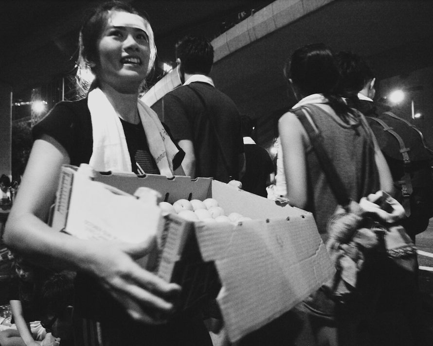 “I am not afraid. I support today’s generation of students. It is their future, and I am here for them.”“Students have integrity and they’re innocent. They are holding the future. Support their fight for universal suffrage and democracy. All civilians should stand up and fight against the Communist Party for their dictatorship and suppression.”Students, fatigued and sweaty, stay composed and bleakly optimistic inside one of the Occupation sites in Admiralty.This double-decker bus was transformed into a medical center by medical school volunteers in Admiralty. Earlier in the afternoon, the owner of the bus wanted the bus back. According to the bus driver’s Facebook page, the bus was cleaned inside and out and returned back to the driver within 10 minutes.The preferred dress of dissent includes goggles, gas masks, ice packs, and iPhones.Protesters camp on a bridge in Central.“Fresh apples! Take as many as you’d like!”A lone cyclist jumps over a barricade and strolls through an empty traffic tunnel. A single figure is rare to see during the revolution.“Here, take this! I made it! I’ve made so many! Take more!”“If you record me, I will kill you!”“Are you press? No? Then get back! Go away!”An assemblage of umbrellas sits quietly in Admiralty in the middle of a roundabout. The name “Umbrella Revolution” seems quite fitting. Umbrellas have many uses in Hong Kong, including shielding yourself from the sun, the rain, the tear gas, and from other people carrying umbrellas.Cantopop classics echoed across Hong Kong Island in half-hearted choruses and jingles. Though the organization and logistics of the occupy movement has been stellar, the chants definitely need more work or they should just get U2 or something.