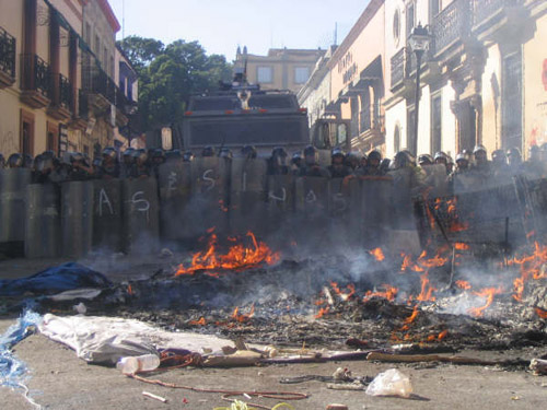 The political climate changed drastically with the attempted desalojo [evacuation] on the 14th of June. Basically, state officials sent in riot police in the middle of the night to forcefully rid the zócalo of the teachers. They used tear gas, fire, reportedly batons, and even firearms to chase the protestors out of the streets. After this event, the political climate in the city was completely different. There was more of an anxious feeling all around, and walking through the zócalo, I was constantly under the impression that something was about to happen. The streets were strewn with what was left of the teachers’ and their families’ belongings, which had been burned by the police. This violent attempt on the behalf of the state to weaken the movement actually strengthened it, and brought people from different socioeconomic sectors to the side of the teachers.