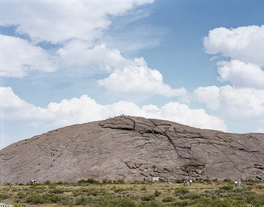 I think [the photograph] “Independence Rock, Wyoming” sheds light on the process. I first read about Independence Rock in Wallace Stegner’s Mormon Country. The history of this place dates back to the frontier days, when westward expansionists saw the Oregon Trail as a path toward opportunity and new beginnings. Independence Rock, in Natrona County, Wyo., served as a landmark and a major fork in this road. Because of its size in relation to the surrounding barren landscape, it can be seen from hundreds of miles away. The rock itself is covered in hand-chiseled signatures, and for a long time it served as a name registry for the countless number of emigrants that would continue onwards, west towards the Willamette Valley or south towards Salt Lake City. Shortly after my arrival, the large group of Mormon missionaries depicted in the photograph scattered themselves on the rock to pay tribute to their forefathers and visit the LDS-run museum that is nearby. It was a very inspiring moment for all.
